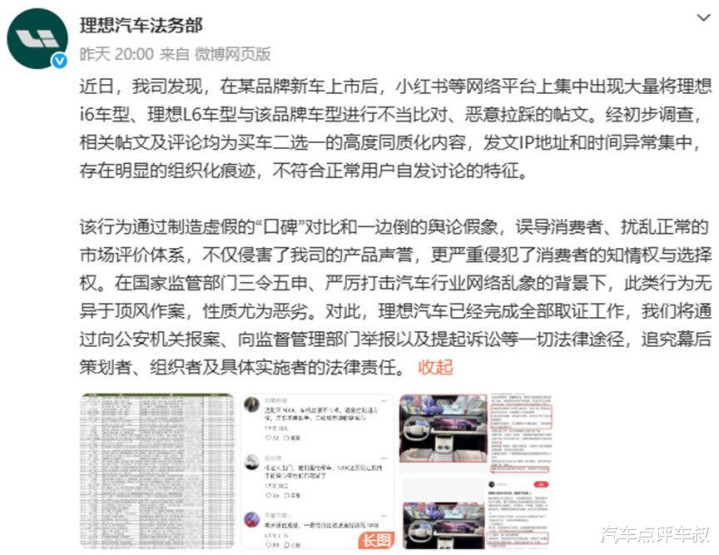 4月11日,理想汽车创始人李想在朋友圈连续发文,控诉某日系品牌在旗下新车NX8上市期间,雇佣营销号对理想i6、L6进行系统性拉踩,并动用大量空白账号“黑水军”攻陷理想产品的评论区。同日晚间,理想法务部也发布声明,宣布已完成取证并将通过法律途径追究责任。