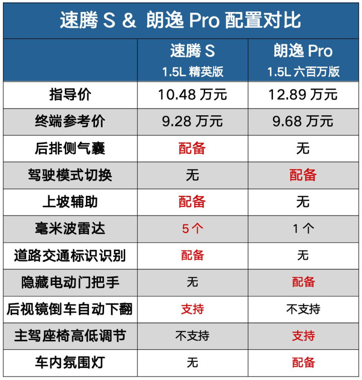 我分别找了各自的中配版本做了个配置对比,目前,速腾S 1.5L精英版的实际售价是9.28万元,朗逸Pro 1.5L六百万版终端优惠完之后的价格是9.68万元,虽然指导价差异挺大,但是俩车的实际售价差异并不大,有句话是咋说得来着——“对大众来讲,指导价是最没有指导意义的。
