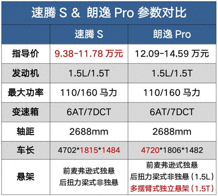 所以我把速腾S和朗逸Pro的参数做了一个简单的对比,可以看到,它俩除了车身尺寸略有差异以外,其他方面,无论是发动机、变速箱,还是轴距,都是一模一样的,不过,朗逸Pro的1.5T版本后悬架为多摆臂式独立悬架,而速腾S全系都是后扭力梁式非独立悬架。