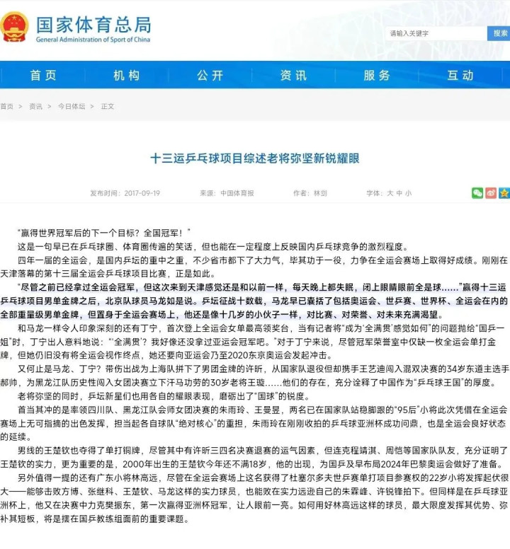 寻找北京队的“遮人”传统时,忽然就看到了一篇名为《十三运乒乓球项目综述老将弥坚新锐耀眼》的文章。文章于2017年9月首发《中国体育报》。