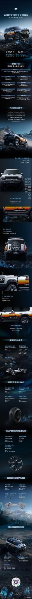 发布会现场公布了纵横G700顶火鸣镝版,上市指导价42.49万元,限时权益价39.99万元,同步推出九重上市专属购车权益。涵盖限时订车礼、金融方案、置换补贴及专属质保政策等多重福利,让每一份对旷野的热爱,都能拥有极致可靠的硬核支撑。