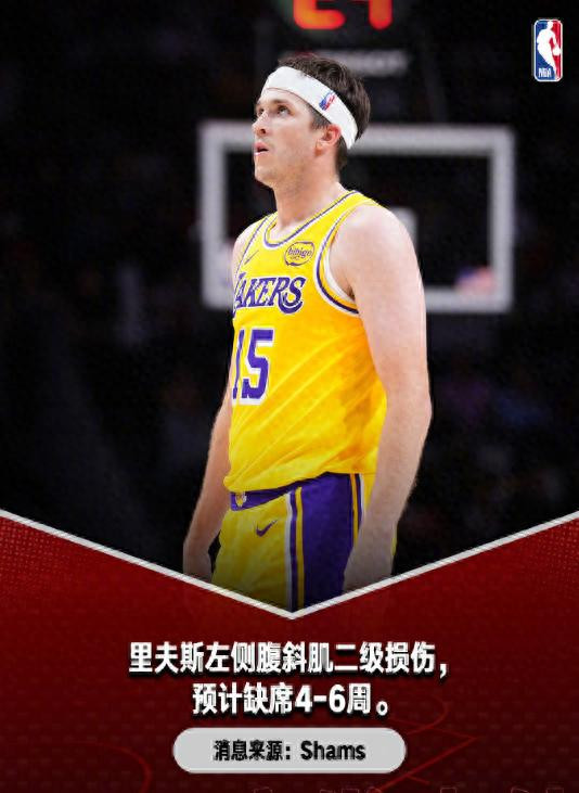 因为扫描错了受伤的地方,所以里弗斯的伤情并没有和东契奇一样,第一时间被发现,而是在里弗斯觉得不舒服之后,湖人队进行了第二次的伤情检验,才发现里弗斯的伤病的,5日一大早,名记SHAMS官宣了里弗斯的情况。